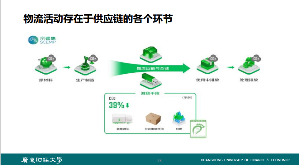 讲座中,朱文文老师首先解析了国家“2030碳达峰、2060碳中和”战略的背景,解释了低碳供应链管理的核心概念,并强调了供应链碳足迹管理的重要性;接着,以京东物流为例,重点介绍了京东物流自研的数字化碳管理产品——京碳惠(scemp),并展示了京东物流通过探索多方参与的商业模式创新,携手供应链上下游成员践行“共享碳足迹”的减碳路径;最后,聚焦于企业碳减排目标的实现机制、数字技术赋能碳减排等四大研究方向。同时,朱博士向研究生们推荐了权威数据库,旨在助力研究生们提升学术研究能力。