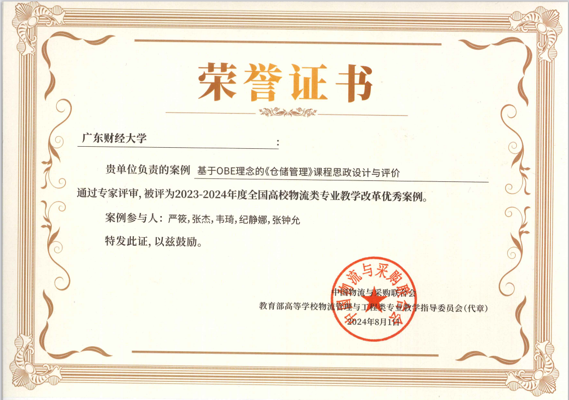 物流管理系撰写的案例“基于obe理念的《仓储管理》课程思政设计与评价”获2023-2024年度全国高校物流类专业教学改革优秀案例。